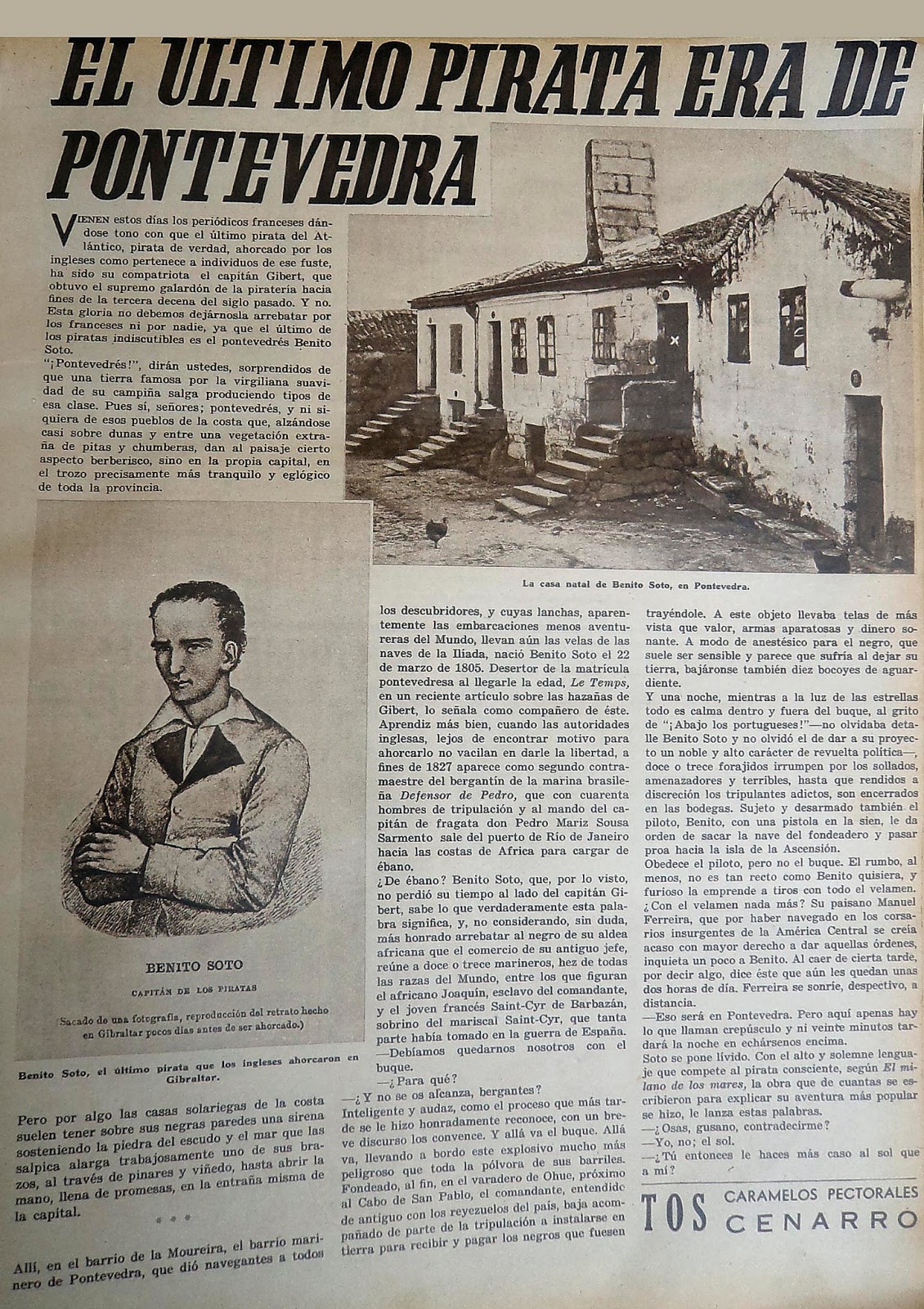 Ahora que parece que está de moda "nuestro" pirata más famoso, el pontevedrés Benito Soto, encontramos un artículo de dos páginas publicado en mayo de 1934 en la revista gráfica madrileña "Estampa", cuyo director era Luis Montiel, donde se ilustra con dos fotografías de principios de siglo del barrio marinero de A Moureira, en una de ellas indican que es la "casa natal" del pirata y en la otra se puede ver a ras de agua una imagen preciosa de lo que era el entorno de la Basílica de Santa María y como el mar llegaba hasta las puertas de las casas de A Moureira de Arriba y el Campo do Boi y cómo aún faltaban unos años para el comienzo de los rellenos que irían desde donde está hoy el colegio "La Aneja" hasta las Corbaceiras. Todo esto gracias al impresionante "fallao" de la casa familiar de Carlos Fiuza el de CICA en la Virgen del Camino que aún no sabe los tesoros que ahí se pueden encontrar. Si es que deberían estar protegidos.